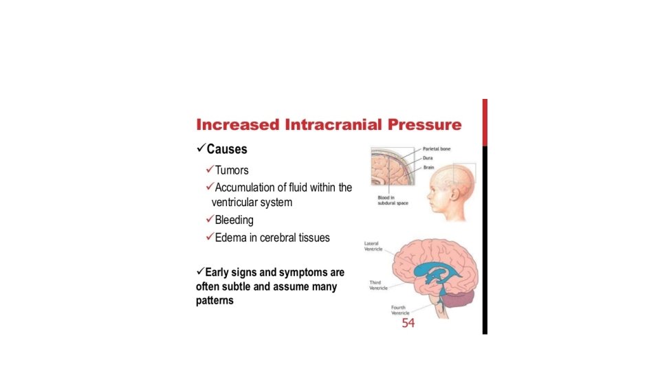 OK, so what is intracranial pressure (ICP)? ? ? • It is the pressure inside the skull and is measured in millimeters of mercury • at rest, it is normally 7– 15 mm. Hg for a supine adult. • The upper limit of ICP is 20– 25 mm Hg • If pressure in the cranium is higher than this upper limit= increased intracranial pressure (= intracranial hypertension.