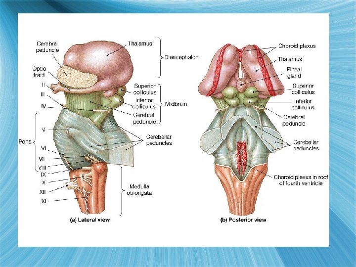 The Brain Stem s Three regions s The midbrain processes visual and auditory information and generates involuntary somatic motor responses. s Pons connects the cerebellum to the brain stem and is involved with somatic and visceral motor control s Medulla oblongata: connects to spinal cord relays sensory information and regulates autonomic functions.