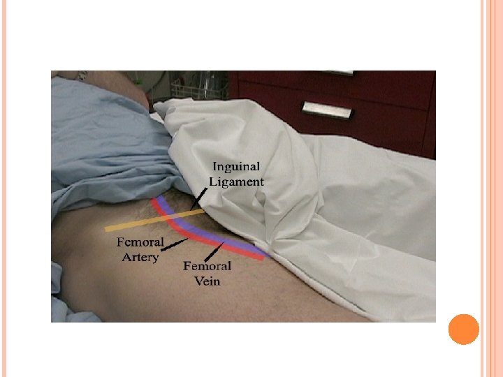 TECHNIQUE the patient is positioned with a rolled towel under the hips for moderate extension. The puncture site should be 1– 2 cm inferior to the inguinal ligament, and 0. 5– 1 cm medial to the femoral artery impulse, with the needle directed at the umbilicus.