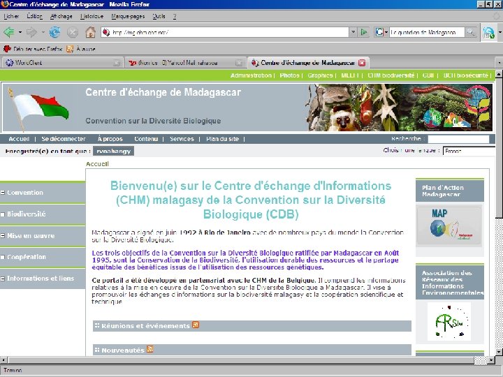 Développement du siteweb CHM/CDB de Madagascar • Désignation de l’ONE comme point focal CHM / CDB • • Développement du site dans le cadre d’un partenariat avec le CHM Belgique (IRSc. NB) en 1998 sous-site de l’ONE Formation d’un cadre de l’ONE en 1999 Mise à jour du site (partenariat avec les institutions oeuvrant dans le domaine de la biodiversité) Developpement de l’European Community CHM (open source, Via Internet, Facilité d’utilisation, Plusieurs utilisateurs, Différents rôles, Pages dynamiques avec métadonnées) lancement en 2005 2004 : Financement de la mise en place des points focaux CHM dans quelques Régions de Madagascar Application aux pays partenaires du CHM Belgique dont Madagascar : Formation des contributeurs et administrateurs du site en 2006 (ONE, ANGAP, MEEFT, SAGE, MAEP) 2007 : Intégration de Madagascar dans le réseau des CHM/CDB avec un nouveau nom de domaine Fin 2007 : Projet d’opérationnalisation et lancement officiel du siteweb
