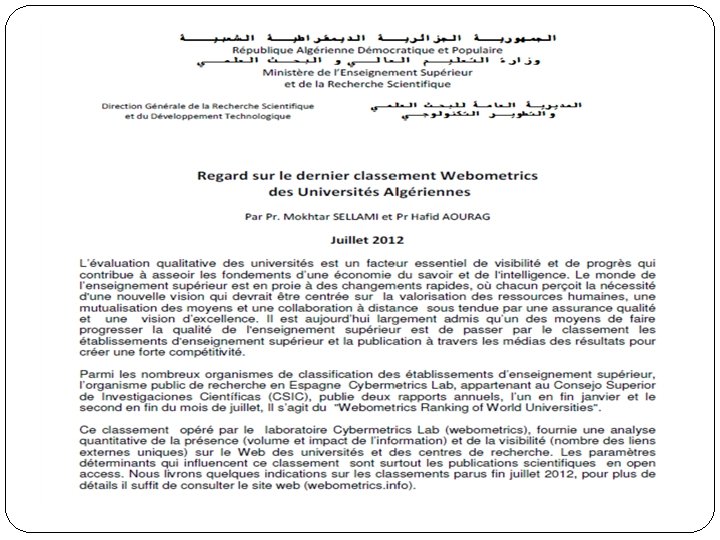 1. 1. Le Discours officiel Il semble que le classement du webometrics a été choisi et qu’un objectif « de placer au moins trois institutions algériennes dans le top 500 à l’horizon 2020 » a été défini. Ce choix est conforté par l’instruction de Mr le Secrétaire général du Ministère émise au mois d’Août 2013 L’instruction de Mr le Secrétaire général du Ministère de l’enseignement supérieure émise au mois d’Août 2013 et qui constitue une véritable feuille de route pour la visibilité du web académique Les analyses faites régulièrement par les responsables de la DGRST lors de la publication des résultats des différents classements mondiaux