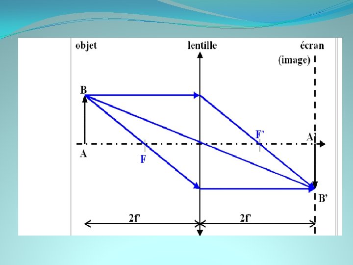 Démonstration: �Formation de l’image par la seconde lentille convergente: Dans le seconde montage, l’image de A par L 1 se trouve à l’infini, qui a lui-même comme image F’ par la lentille L. Si l’on se restreint à la lentille L 2, F’ est l’objet et A’’ l’image: F’ A’’