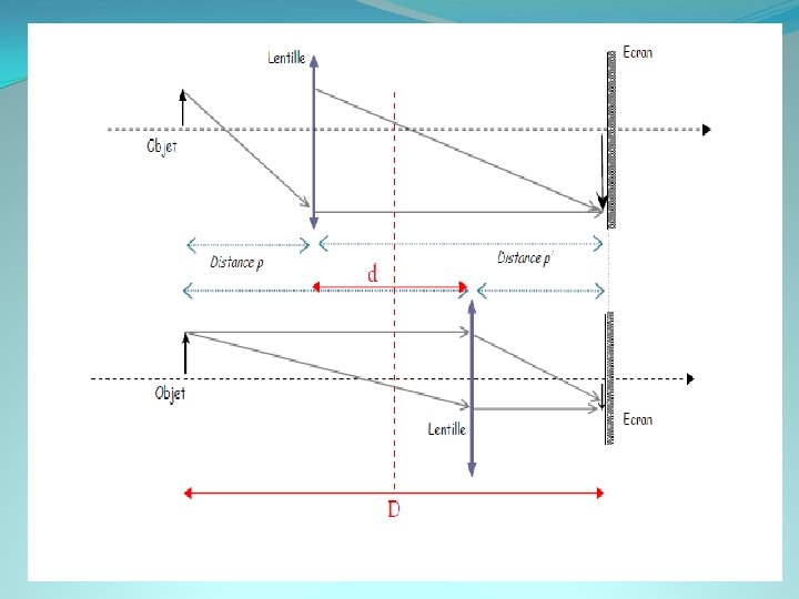 Lentille convergente , divergente �Pour une lentille divergente, le déplacement D est positif et la distance focal image est négative �Pour une lentille convergente, le déplacement D est négatif mais ne peut être supérieur à la distance focale de la lentille L 2 en valeur absolue: f’> F’ 2