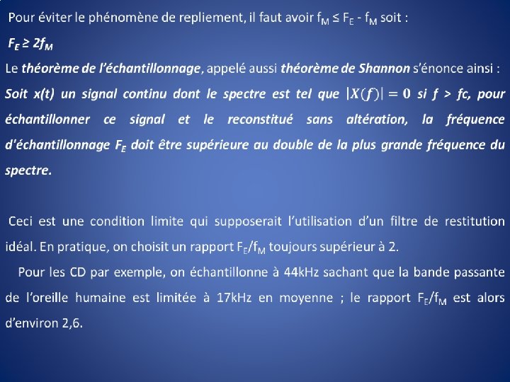X(f) f f. M FE Xech(f) Sc() f f. M FE- f. M FE FE+ f. M 2 FE- f. M FE 2 FE+ f. M L’échantillonnage produit donc une reproduction du spectre autour des fréquences n. FE.