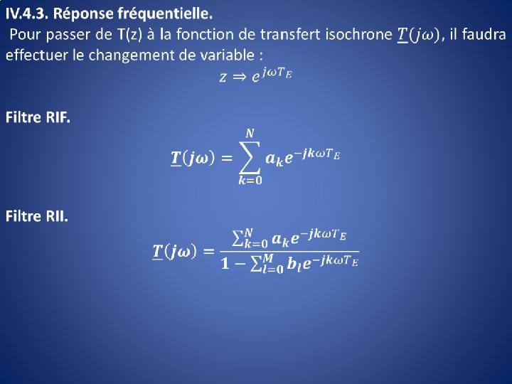 IV. LES FILTRES NUMERIQUES. Pour les traitements lourds, comme le filtrage des signaux vidéo par exemple, les structures numériques remplacent avantageusement les circuits analogiques. Les méthodes de synthèses consiste, en pratique, à trouver la fonction de transfert isochrone (en jω) du filtre analogique puis de la transposer dans le plan des z afin d’établir l’algorithme à programmer.