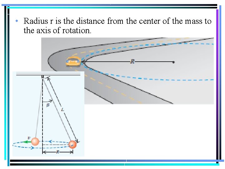 • Radius r is the distance from the center of the mass to the axis of rotation.