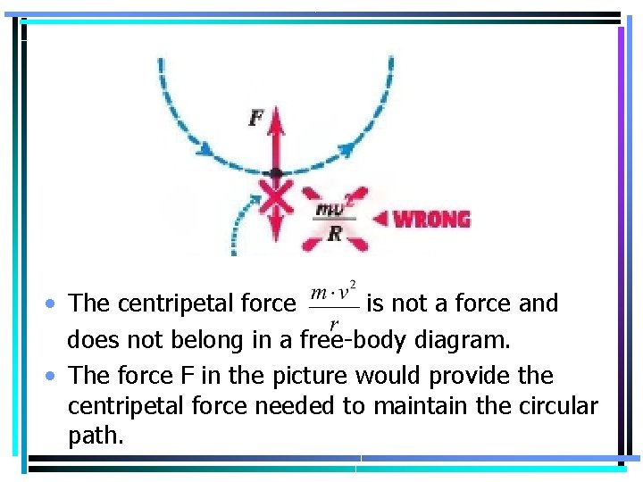 • The centripetal force is not a force and does not belong in a free-body diagram. • The force F in the picture would provide the centripetal force needed to maintain the circular path.