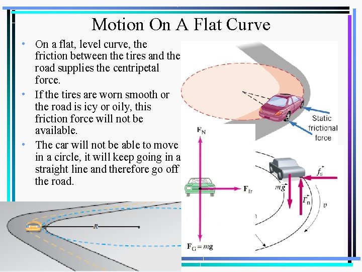 Motion On A Flat Curve • On a flat, level curve, the friction between the tires and the road supplies the centripetal force. • If the tires are worn smooth or the road is icy or oily, this friction force will not be available. • The car will not be able to move in a circle, it will keep going in a straight line and therefore go off the road.