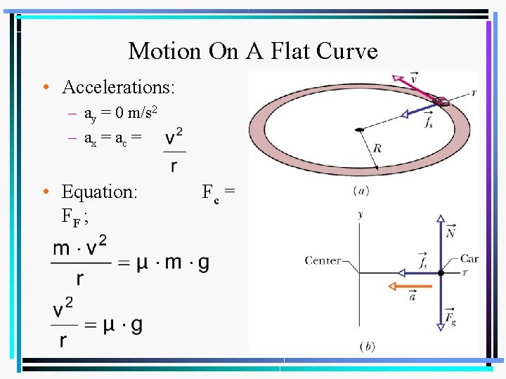 Motion On A Flat Curve • Accelerations: – ay = 0 m/s 2 – ax = a c = • Equation: FF ; Fc =