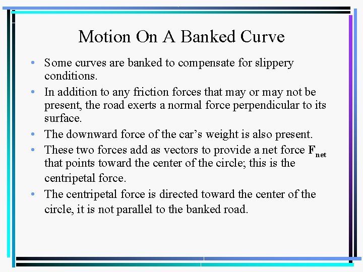 Motion On A Banked Curve • Some curves are banked to compensate for slippery conditions. • In addition to any friction forces that may or may not be present, the road exerts a normal force perpendicular to its surface. • The downward force of the car’s weight is also present. • These two forces add as vectors to provide a net force Fnet that points toward the center of the circle; this is the centripetal force. • The centripetal force is directed toward the center of the circle, it is not parallel to the banked road.