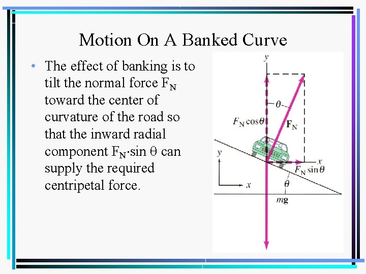 Motion On A Banked Curve • The effect of banking is to tilt the normal force FN toward the center of curvature of the road so that the inward radial component FN sin can supply the required centripetal force.