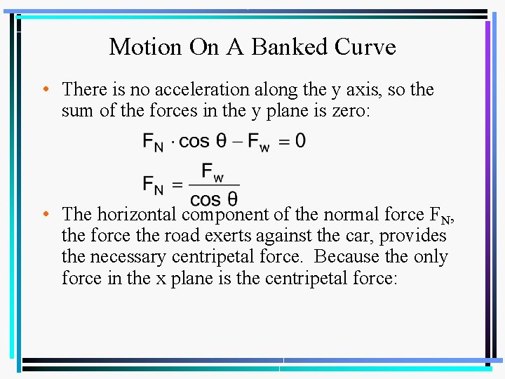 Motion On A Banked Curve • There is no acceleration along the y axis, so the sum of the forces in the y plane is zero: • The horizontal component of the normal force FN, the force the road exerts against the car, provides the necessary centripetal force. Because the only force in the x plane is the centripetal force: