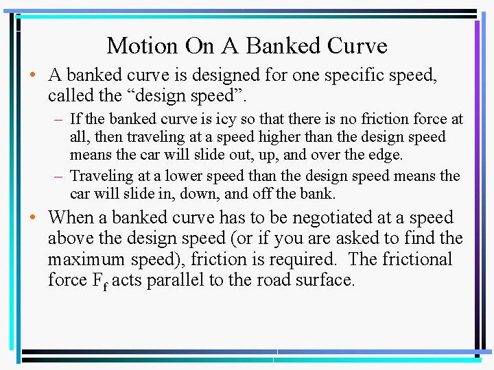 Motion On A Banked Curve • A banked curve is designed for one specific speed, called the “design speed”. – If the banked curve is icy so that there is no friction force at all, then traveling at a speed higher than the design speed means the car will slide out, up, and over the edge. – Traveling at a lower speed than the design speed means the car will slide in, down, and off the bank. • When a banked curve has to be negotiated at a speed above the design speed (or if you are asked to find the maximum speed), friction is required. The frictional force Ff acts parallel to the road surface.
