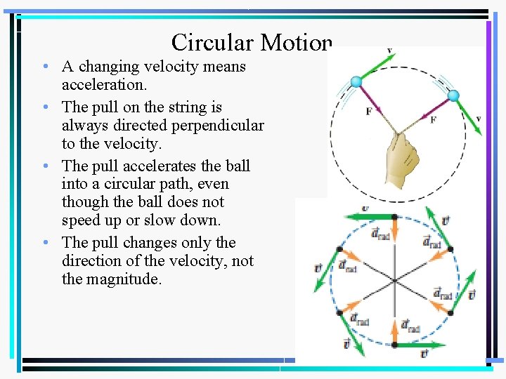 Circular Motion • A changing velocity means acceleration. • The pull on the string is always directed perpendicular to the velocity. • The pull accelerates the ball into a circular path, even though the ball does not speed up or slow down. • The pull changes only the direction of the velocity, not the magnitude.