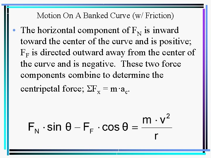 Motion On A Banked Curve (w/ Friction) • The horizontal component of FN is inward toward the center of the curve and is positive; FF is directed outward away from the center of the curve and is negative. These two force components combine to determine the centripetal force; ΣFx = m·ac.