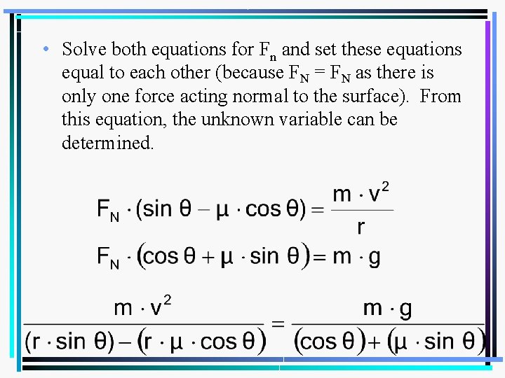 • Solve both equations for Fn and set these equations equal to each other (because FN = FN as there is only one force acting normal to the surface). From this equation, the unknown variable can be determined.