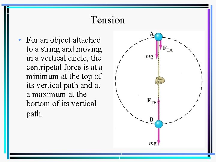 Tension • Top: the centripetal force on the object equals the tension of the string plus the weight of the ball, both acting toward the center of the vertical circle. Mathematically: • Bottom: the centripetal force on the object is equal to the difference between the tension of the string and the weight of the object. The tension is exerted inward toward the center of the vertical circle, while the weight is directed away from the center of the vertical circle. Mathematically: