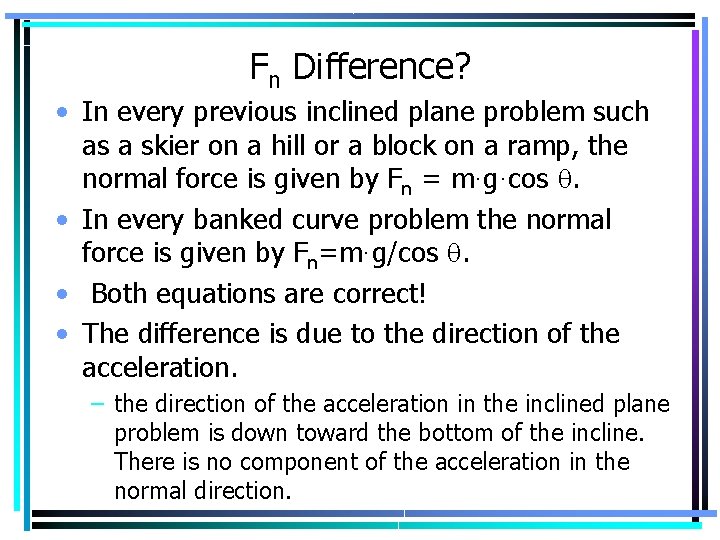 Fn Difference? • In every previous inclined plane problem such as a skier on a hill or a block on a ramp, the normal force is given by Fn = m·g·cos . • In every banked curve problem the normal force is given by Fn=m·g/cos . • Both equations are correct! • The difference is due to the direction of the acceleration. – the direction of the acceleration in the inclined plane problem is down toward the bottom of the incline. There is no component of the acceleration in the normal direction.
