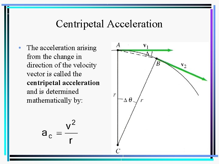 Centripetal Acceleration • The acceleration arising from the change in direction of the velocity vector is called the centripetal acceleration and is determined mathematically by: