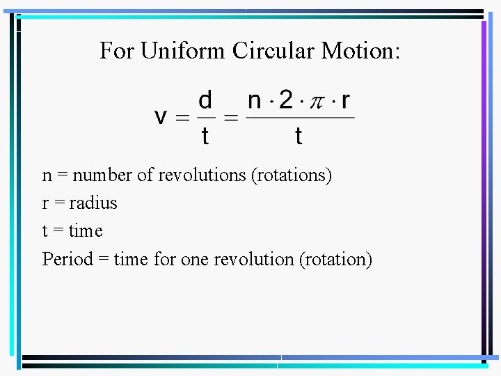 For Uniform Circular Motion: n = number of revolutions (rotations) r = radius t = time Period = time for one revolution (rotation)