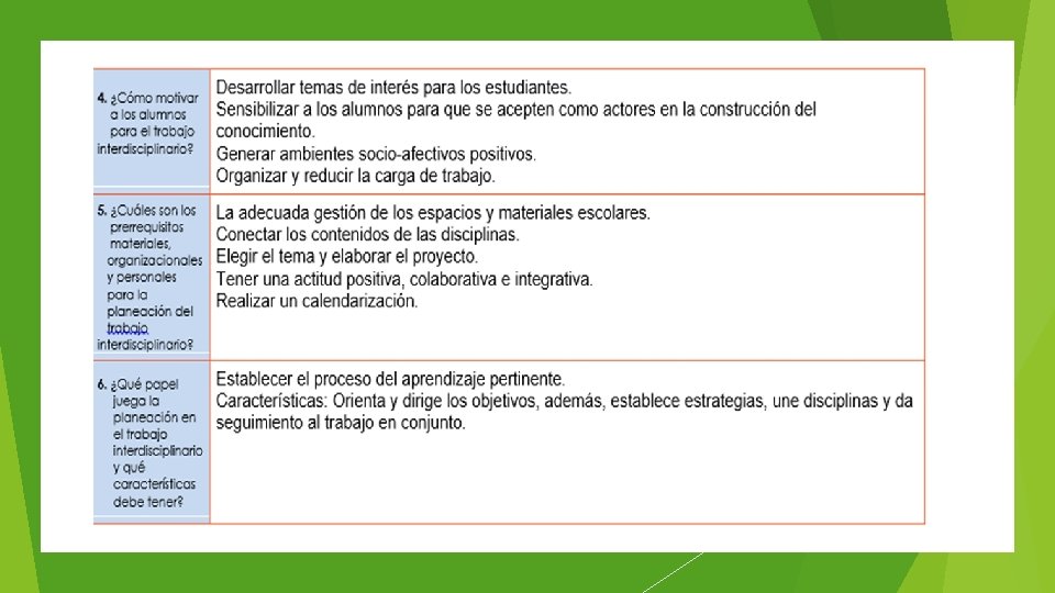 Gestión de Proyectos interdisciplinarios ¿Qué factores se deben tomar en cuenta para hacer un proyecto? ¿Cómo se deben organizar? Planificación colaborativa Establecer los conceptos clave que se utilizan y que están incluidos en la currícula de las asignaturas involucradas. Establecer las herramientas de evaluación. Calendarizar las actividades. Dividir en etapas el proyecto con productos medibles. ¿Cómo se pueden identificar los puntos de interacción que permitan una indagación, desde situaciones complejas o la problematización? El maestro es el primer investigador, debe comprender los factores y las relaciones complejas que se dan entre ellos. Realizar preguntas clave que no tengan respuestas inmediatas Elementos de la realidad involucrados Desde el pensamiento crítico. Si se toma en cuenta lo que se hace generalmente, para el trabajo en clase ¿Qué cambios deben hacerse para generar un proyecto interdisciplinario? Cambios en la disposición del trabajo individual al trabajo en grupo. Disposición del docente para seguirse formando Revisión de los estilos de enseñanza Generar los espacios de comunicación entre los docentes. Buscar conceptos fuertes que tengan interacciones. ¿Cómo beneficia al aprendizaje el trabajo interdisciplinario? Da sentido al conocimiento al hacer conexiones entre las disciplinas, aprendizaje colaborativo y vincularlo con la realidad. El desarrollo profesional y la formación docente ¿Qué implicaciones tiene, dentro del esquema de formación docente, el trabajo orientado hacia la interdisciplinariedad? Para el proceso de aprendizaje del docente desde un punto de vista holístico porque se relaciona con otras asignaturas. ¿Qué dimensiones deben tenerse en cuenta para proyectos interdisciplinarios? Contexto Infraestructura con la que se cuenta Las fuentes documentales disponibles Recursos humanos con los que se cuenta Tiempo disponible