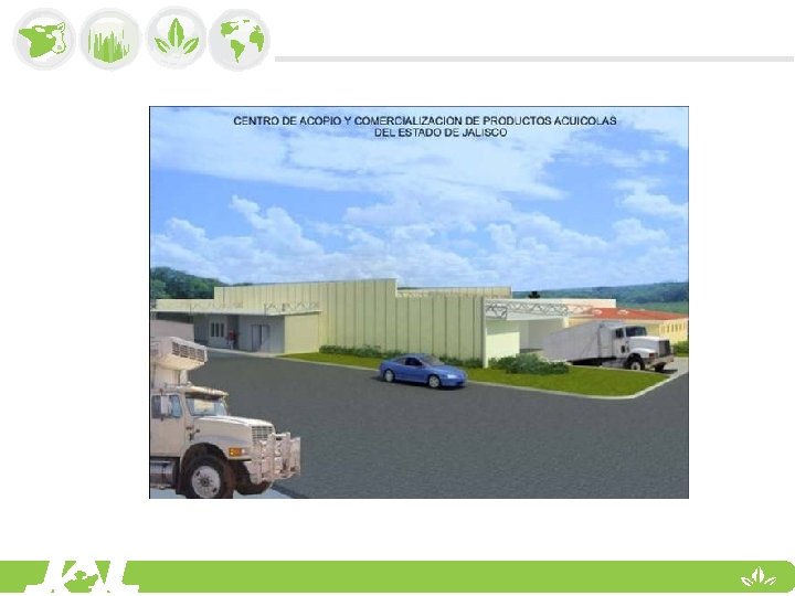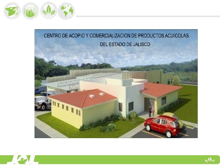 OBJETIVO CENTRO DE ACOPIO ACUICOLA Incentivar la producción y fortalecer la comercialización de productos pesqueros y acuícolas, estableciendo un centro de acopio que promueva la comercialización de productos provenientes de la Pesca y la Acuacultura en el estado de Jalisco, que cuente con una planta de proceso para dar valor agregado a la producción, cumpliendo con los estándares nacionales e internacionales vigentes de sanidad e inocuidad y con ello posesionar el producto bajo una marca propia y certificados de calidad.
