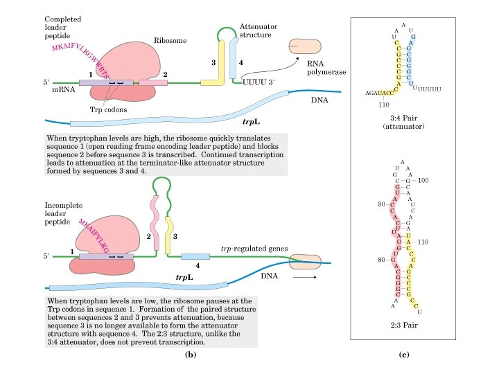 Atenuação da transcrição RNAm trip (baixos níveis de triptofano) RNAm atenuado (níveis altos de triptofano) Todos os genes do operon são transcritos
