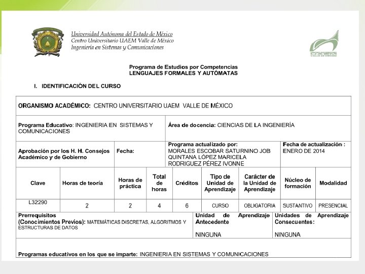 Referencias • S. N. Sivanandam & M. Janaki Meena. Theory of Computation. I K International Publishing House, 2009. • Frederic P. Miller, Agnes F. Vandome, John Mc. Brewster. Formal Language. Alphascript Publishing, 2010. • Sudkamp Thomas. Languages and Machines: An introduction to theory of Computer Science. 3 rd Edition. Addison Wesley, 2005. • Hopcroft J. , Motwani R. , Ullman J. Introduction to Automata Theory, Languages, and Computation. 3 rd Edition. Addison Wesley, 2006. Dra. Maricela Quintana López