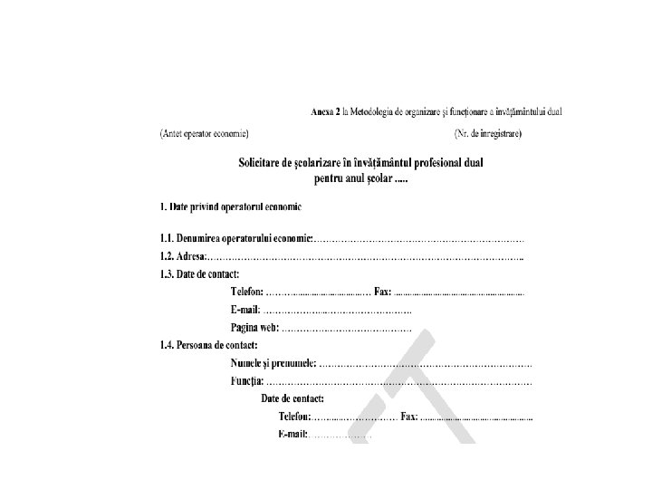 Operatori economici parteneri de practică în învăţămîntul dual • Denumirea generică de operatori economici utilizată în metodologie include: agenți economici/ instituții publice/ alte organizații - persoane juridice, care îndeplinesc condiţiile legale referitoare la capacitatea juridică de angajator • Calitatea de potenţiali angajatori şi parteneri de practică se referă la interesul şi capacitatea juridică de a angaja forţă de muncă pe bază de contract individual de muncă, şi de a încheia contracte pentru practica elevilor din învăţământul dual Interesul de a angaja forţă se referă la angajamentul asumat de op. economici, prin contractul de parteneriat, de a oferi, cu prioritate, locuri de muncă absolvenţilor pe care i-a format în baza contractelor de practică, în conformitate cu nivelul de pregătire şi competenţele certificate, iar, în cazul celor pe care nu-i pot angaja în termen de cel mult 2 luni de la susţinerea cu succes a examenului de certificare a calificării, de a-i sprijini activ pentru tranziţia la un loc de muncă, colaborând în acest scop, după caz, cu alţi angajatori, AJOFM etc. Sunt asimilate operatorilor economici, în înţelesul metodologei, şi organizaţiile care acţionează în numele acestora (asociaţii/clustere/consorţii de operatori economici) pentru încheierea contractelor care reglementează colaborarea în învăţământul dual. • •