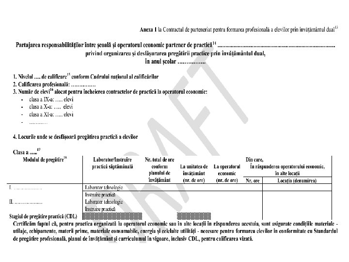 Contractul de parteneriat (2) • Obligaţia de a încheia un nou contract de parteneriat pentru anul şcolar imediat următor: − se aplică atâta timp cât se iniţiază noi clase de început şi atâta timp cât există clase de elevi cuprinşi în pregătire în baza angajamentelor asumate prin contractele semnate anterior, până la finalul duratei de şcolarizare a acestora, în funcţie de nivelul de calificare, inclusiv eventuale stagii suplimentare de practică, susţinerea examenului final de certificare a calificării şi o perioadă de tranziţie la un loc de muncă pentru absolvenţii anului terminal. − această obligaţie încetează doar pentru operatorii economici care nu vor mai avea elevi în practică la nicio clasă din anul şcolar respectiv, cu condiţia respectării prevederilor mai sus menţionate.