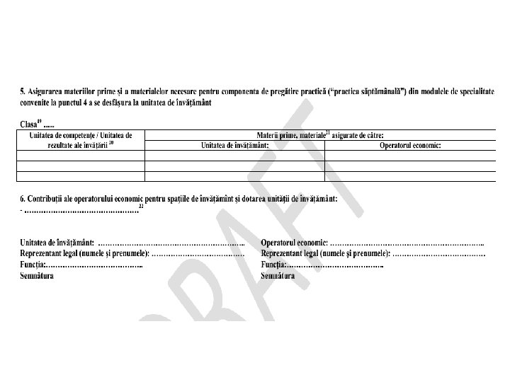 Obligaţiile unităţii de învăţământ (1) • asigurarea spaţiilor de instruire cu dotările aferente pentru pregătirea teoretică şi componenta de pregătire practică din modulele de specialitate, convenită a se desfăşura la unitatea de învăţământ, în concordanţă cu standardul de pregătire profesională, planurile de învăţământ şi curriculumul în vigoare; • asigurarea materiilor prime, materialelor consumabile, energiei electrice şi a celorlalte utilităţi necesare pregătirii practice organizată la unitatea de învăţământ pentru dobândirea calificării profesionale, în concordanţă cu SPP, planurile de învăţământ şi curriculumul în vigoare; • asigurarea resurselor umane necesare pentru pregătirea teoretică şi practică a elevilor, organizată la unitatea de învăţământ; • asigurarea unui cadru didactic coordonator pentru fiecare grupă de elevi la instruirea practică, responsabil pentru monitorizarea pregătirii practice derulate la operatorii economici; • asigurarea echipamentelor de lucru şi de protecţie pentru elevi, pe perioadele de formare derulate la unitatea de învăţământ;