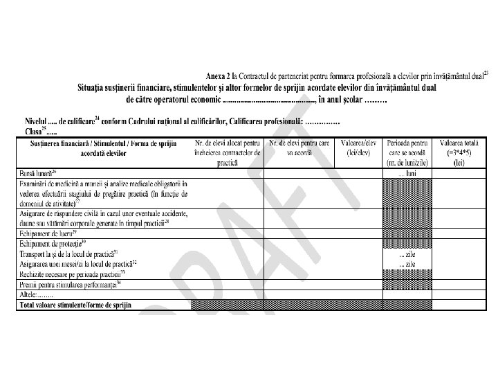 1. Se completează conform Nomenclatorului calificărilor profesionale pentru care se asigură pregătirea prin învăţământul profesional, aprobat prin HG 866 din 13 august 2008 2 - Indicarea preferinței pentru o unitate de învăţământ este opțională. Alocarea pe unităţi de învăţământ a cifrei de şcolarizare în învăţământul profesional dual se va realiza ţinând cont de preferinţele operatorilor economici şi în funcţie de posibilităţile de constituire a formaţiunilor de studii, cu respectarea reglementărilor referitoare la efectivelor minime şi maxime de elevi în conformitate cu articolul 63, alineatul (1) litrele e 1), e 2) și e 3), din OUG nr. 81/2016 3 - Cerinţă în conformitate cu articolul 25, alineatul (4) lit. c) din OUG nr. 81/2016. În anul şcolar 2016/2017, în baza H. G. nr. 1062 din 30. 10. 2012, elevii care frecventează învăţământul profesional elevii din învăţământul profesional beneficiază de o „bursă profesională“ care constă într-un sprijin financiar lunar de 200 lei, al cărui cuantum poate fi modificat anual prin hotărâre a Guvernului, la propunerea MENCȘ.
