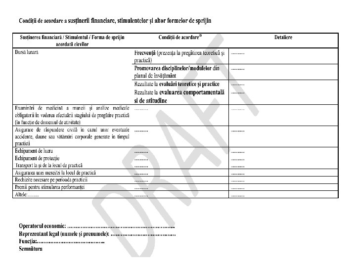 Obligaţiile operatorilor economici (2) • cheltuieli pentru asigurări de răspundere civilă în cazul unor eventuale accidente, daune sau vătămări corporale generate în timpul pregătirii practice la operatorul economic, pentru elevi (în funcție de domeniul de activitate); • burse pentru elevi cel puțin la nivelul celei acordate din fonduri publice; • alte forme de sprijin materiale şi stimulente financiare convenite prin contractul de parteneriat; • asigurarea condiţiilor necesare (dotări, materii prime, materiale consumabile, utilităţi etc. ) pentru derularea probelor de admitere și a examenelor de certificare a calificării profesionale a elevilor, în funcţie de locaţia convenită pentru organizarea acestora; • asigurarea condiţiilor necesare pentru evaluarea continuă a elevilor în cadrul pregătirii practice la operatorul economic; • angajarea altor cheltuieli necesare pentru formarea de calitate a elevilor;