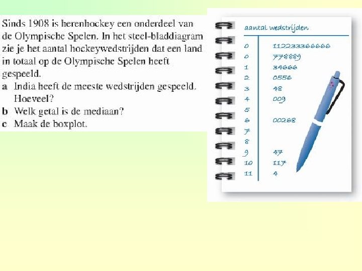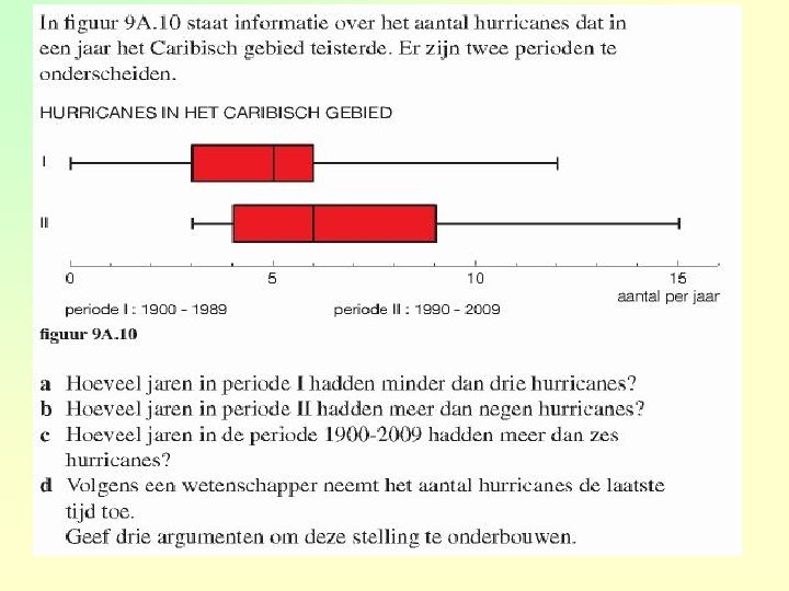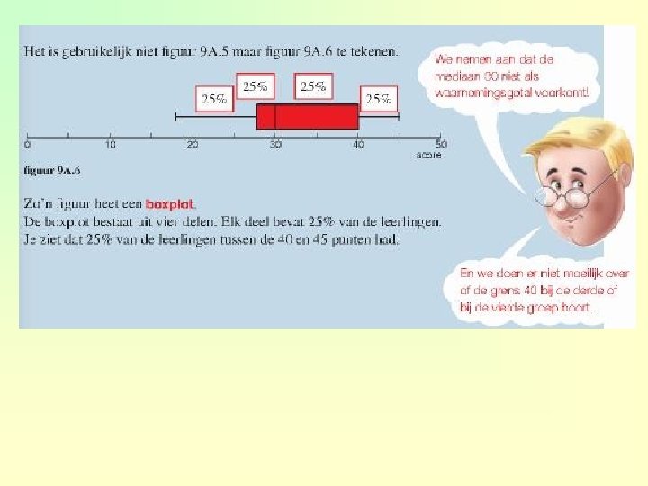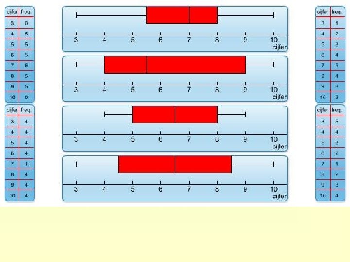 Hoe teken je een boxplot? 1 bepaal de mediaan 2 bepaal het eerste kwartiel (mediaan van de “ 1 e” helft) en het derde kwartiel (mediaan van de “ 2 e” helft) 3 teken een getallenlijn en zet het kleinste en grootste waarnemingsgetal, de mediaan en de beide kwartielen boven de getallenlijn 4 teken de boxplot 4. 4