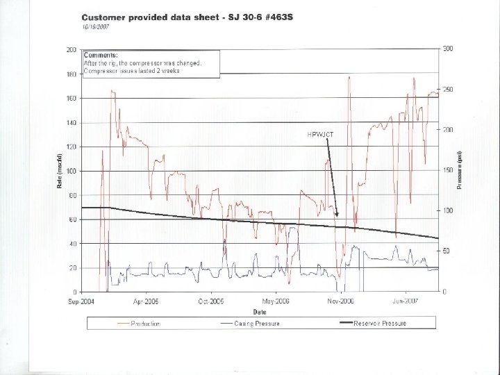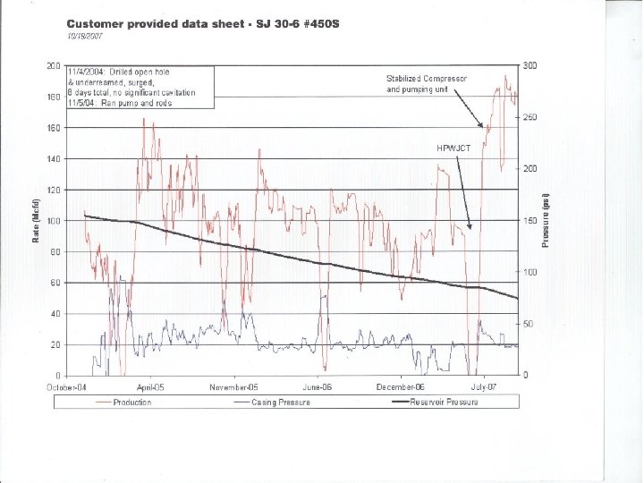 • • • • • Analysis The inserts in this brochure contain some very pertinent information. Referring to the two glossy well data graphs titled Customer provided data sheet -SJ 30 -6 #463 S and #450 S , please note the red line representing production using the scale on the left side of the graph. Cenjet 90’s “High Pressure Water Jet Cutting Technology” is abbreviated HPWJCT. This denotes when the well was reworked on the timeline at the bottom of the page. The blue line indicates casing pressure as measured inside the well using the scale on the right side of the graph. The black line is the reservoir pressure in the coal formation also using the scale on the right. Results 1. The production curve shows a steep decline from the wells initial completion in 2004 and an impressive increase after HPWCT. 2. This increase in production occurs as the reservoir pressure continues to rapidly decline. This is a significant fact; normally one would expect production to be negatively impacted by a drop in formation pressure. 3. The casing pressure is noteworthy as well; the inverse correlation between production and casing pressure can usually be explained by wellhead issues. For example, if a compressor or a water pump malfunctions, production declines and the well builds up casing pressure, this is evident on the graph. However, after HPWCT, the wells exhibit both an increase in casing pressure and production. The two inserts titled SJ 30 -6 #450 S and SJ 30 -6 #463 S illustrate the wells performance from completion to present. The results are very impressive considering the depleted state of the reservoir and its continuing decline. Conclusion The Cenjet 90 stimulation increases gas production and the wells have sustained this up kick for over two years to date. This establishes new reserves which increases both the life and value of the well. This technology has proven to be beneficial in rehabilitating underperforming wells. Therefore, the process should have similar results when used for initial completion.