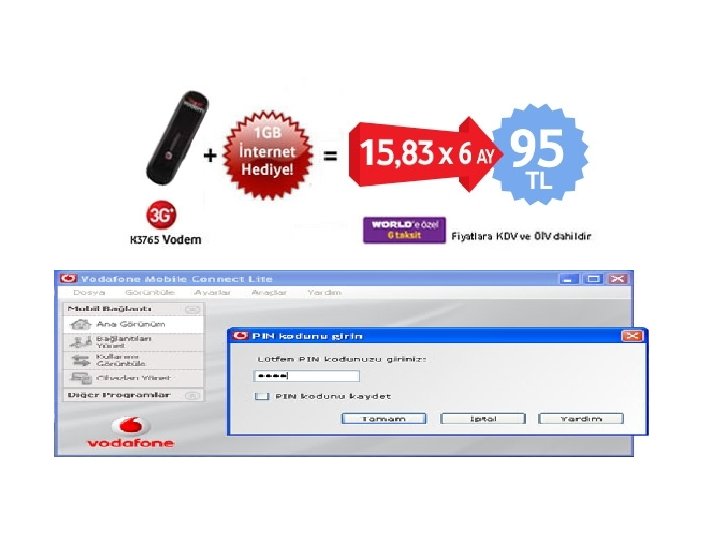 ESASLAR Fiyatlara KDV ve ÖİV Dahildir. Faturasız Vodem Kampanyası kapsamında, tüm mevcut veya yeni bireysel faturasız hat aboneleri kampanyalı cihazı alarak kampanyaya dahil olabileceklerdir. Kampanya kapsamında abonelerimize sunulacak olan E 160 E model vodemin son kullanıcı satın alma fiyatı 65 TL , K 3765 model vodemin son kullanıcı fiyatı ise 95 TL olarak belirlenmiştir. Aboneler 3 G aboneliklerini başlatııkları takdirde promosyon datayı 3 G networkunde kullanacaklardır; bu durumda abonelere 1 Mbps'ye kadar hız ile hizmet verilir. Aboneliğini 3 G’ye açtırmayan aboneler mevcut data altyapısını (2 G/edge) kullanacaklardır. Vodafone Süper Hızlı Mobil Internet hizmetinden faydalanmanız için 3 G yazıp 3636'ya göndererek 3 G aboneliğini başlatmış olmanız ve Vodafone 3 G kapsaması içerisinde olmanız gerekmektedir. Vodafone 3 G kapsaması coğrafi koşullara bağlı olarak değişiklik gösterebilir. Kampanyaya dahil olan abonelerin hattına bir kereleğine 1 GB hediye data yüklenecektir. Hediye data kullanım süresi 30 gün olarak belirlenmiştir; 30 gün içerisinde kullanılmayan MB/GB miktarı bir sonraki aya devretmez. Kullanım limiti dahilinde aboneler yurtiçi WAP ya da diğer internet sitelerine bağlantı kurduklarında extra ücretlendirilmeyecektir. Aboneler ayrıca bir 3 G internet paketi seçebilirler, seçmiş oldukları paket üzerinden ayrıca ücretlendirileceklerdir. Aboneler, yeni hat satın almaları durumunda ilgili hattın başlangıç paketi fiyatını ayrıca satın aldıkları kanala öderler. Hediye edilen data miktarının içine satın alınan içerik ücretleri dahil değildir. İçerik hizmetleri ayrıca ücretlendirilir. Hediye olarak verilen data kullanımı ile üçüncü sahışlara data transferi yapılamayacaktır. Hediye data miktarı bittiği takdirde aboneler hangi data paketini kullanıyorlarsa onun üzerinden ücretlendirilirler; hiçbir data paketine sahip olmamaları durumunda standart tarifeden ücretlendirileceklerdir. Bir GSM numarası sadece bir kere kampanyadan yararlanabileceklerdir. Bir müşteri numarasına bağlı tüm abonelikler (GSM numaraları) aynı anda kampanyadan faydalanabilirler. "DATA BAKIYE" yazıp 4646'ya göndererek ne kadar ücretsiz kullanımınız kaldığını öğrenebilirsiniz. Hattın iptal olması veya abonenin faturasız bir hattan faturalı bir hatta geçiş yapması halinde hediye data miktarı iptal edilecektir. Kampanya kapsamında aboneler Yapı Kredi World Card, Fortis World Card, Vakıf World Card ve Anadolu World Card kredi kartları ile 6 taksit avantajından yararlanabileceklerdir. Kampanyaya ait cihazlarda oluşabilecek arıza veya herhangi bir nedenle yapılacak olan geri iade işlemlerinden sorumluluk ithalatçı firma, satışın yapıldığı mağazaya aittir. Bu gibi durumlarda VF A. Ş. herhangi bir sorumluluğu bulunmamaktadır. Vodafone kampanya koşullarını değiştirme hakkını saklı tutar. Kampanya stoklarla sınırlı olup 31 Aralık 2010 günü sona erecektir.
