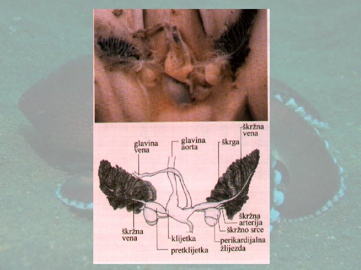 CREVNI SISTEM • Usta, ždrelo sa radulom i čeljusti, jednjak • Kesasti želudac, izduženi cekum, divertikulum cekuma • Srednje crevo, rektum sa analnim otvorom • Digestivna žlezda, akcesorna žlezda-pankreas (hepatopankreas) • Pljuvačne žlezde • Mastiljava kesa • Predatori (rakovi, drugi mekušci, ribe, sopstvena mlađ)