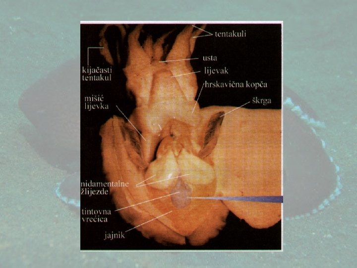 UNUTRAŠNJA ANATOMIJA • Kopče za prikopčavanje plašta • Musculus depressor infudibuli • U plaštanoj duplji: 2 škrge, analni otvori sa dve jezičaste papile, otvori bubrežnih kesa i otvor gonade. • Mastiljava kesa • Plaštane ganglije • Nidamentalne i akcesorne nidamentalne žlezde (kod ženki)