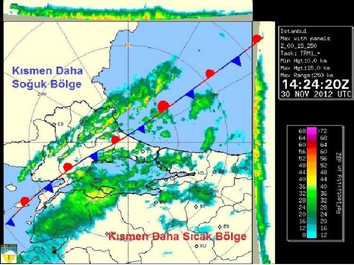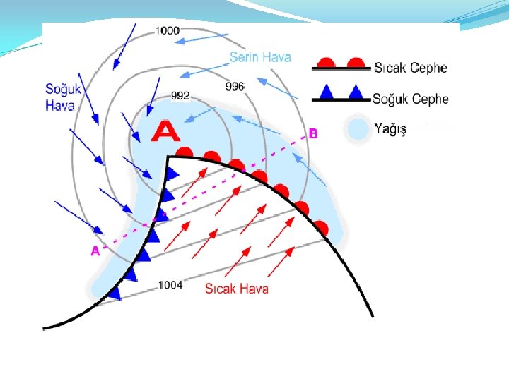 Sıcak Cephede Meteorolojik Elemanların Değişimi Cephe Basınç Rüzgar Bulut Hava Rüyet Sıcaklık Cephe Önünde Devamlı Düşer Rüzgar Artar Ci-Cs-As. Ns 200 -300 milden itibaren yağış veya kar Yağış yoksa rüyet çok iyi Hafifçe yükseliş Cephe Geçerken Düşüş Durur Veering (Rüzgarın Ns-Yağış kısmen saat yada istikametinde tamamen ki dönüşüne ) durur Aralıklı yağış veya yağış durur Görüş zayıf, bazen sis, mist görülür Yükselmeye başlar Cephe Arkası Çok az değişim Bulutlu hava veya çisenti. Bazende aralıklı yağış Zayıf yada orta görüş. Bazen yoğun sis, mist Hafifçe Değişim Yönde değişme olmaz St