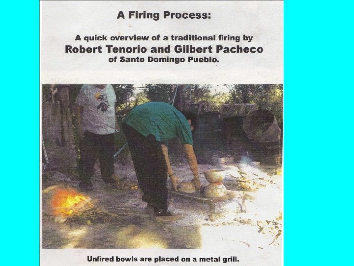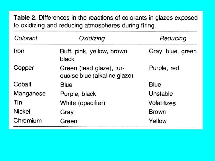 Terms Related to Firing Environment • Oxidizing: a free flow of oxygen reaches the vessels during firing. Minerals in the paste, slip, and paint are converted to their oxide forms, causing color changes. • Reducing: Oxygen is cut off to the fire during the latter stages of the firing process. Additional carbon may be thrown onto to fire beforehand, and the carbon is driven into the fabric of the pot, turning it black. Minerals turn into their unoxidized forms.