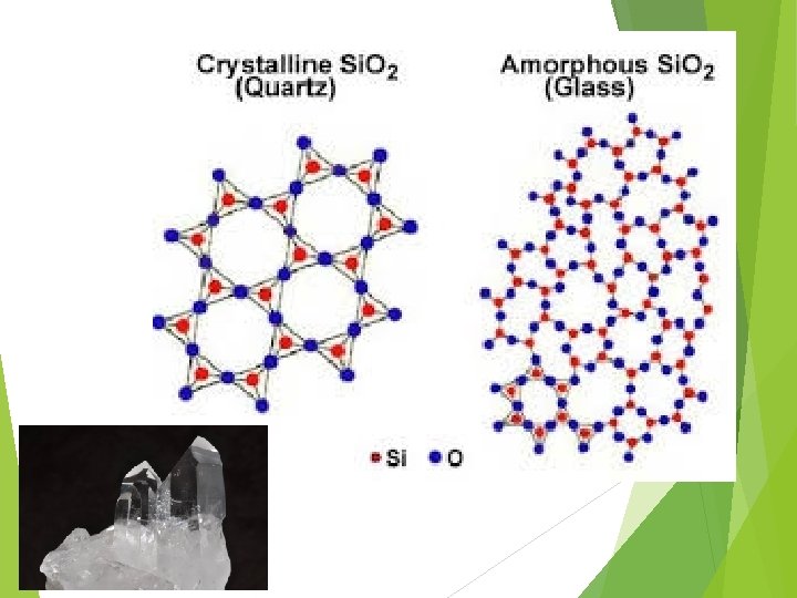 Main Ingredients for Glass 1. Silica(silicon dioxide, Si. O 2) – – the chief constituent of sand quartz-silica in crystalline form=mineral fused silica=silica in amorphous form=glass However, fused silica is not used for commercial glass products for 2 reasons: • • it has a super high melting point (1650 C or 3000 F) when molten it has a very high viscosity and is difficult to form.