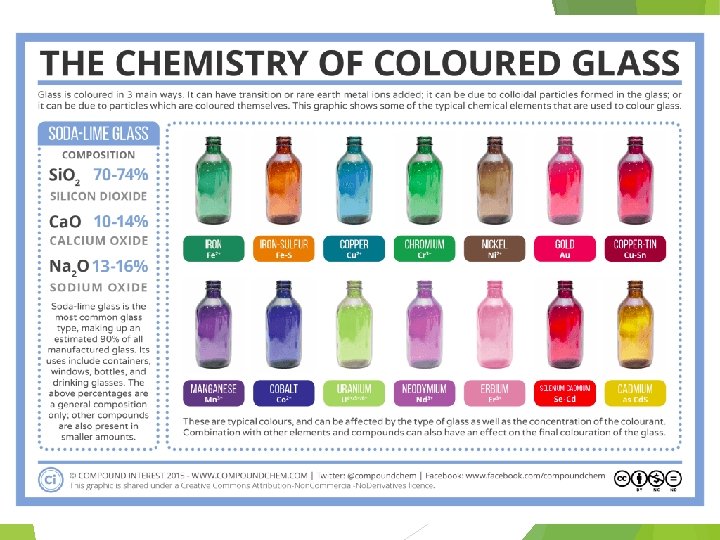 Other Ingredients in Glass • Fining agents – small amounts of other compounds added to help get rid of gas bubbles formed during melting process. • Many other ingredients -give specific colors or other properties. – For example, iron oxides can be added to give glass a green color and help absorb heat