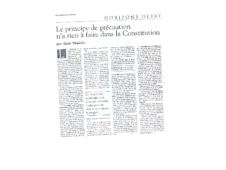 Un triste exemple de critique inepte • Un ancien ministre qui s’et souvent trompé gravement (la Soufrière, l’amiante à Jussieu) écrit sous le titre principe de précaution, piège à c… (sic) : « Nous vivons sous la dictature du principe de précaution. Après le principe de l’action et de la réaction, le principe d’équilibre, le principe d’harmonie, , le principe d’Archimède, voici le principe de précaution» . • Aveuglé par sa passion, cet éminent (dans son domaine) membre de l’Académie des Sciences, ignore donc les différentes acceptions du mot principe.