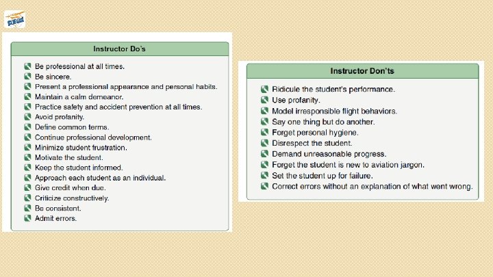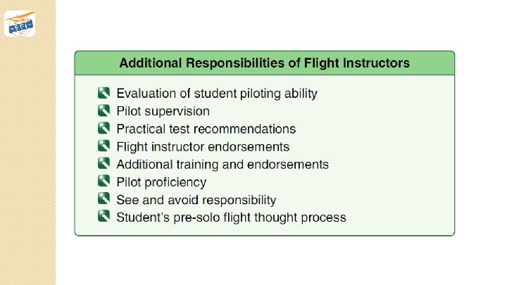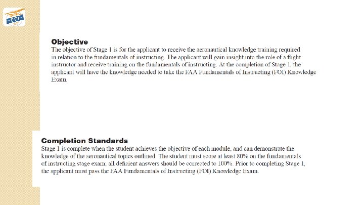 Course Elements ü Fundamentals of Instructing (How to teach) ü Technical Subject Areas (What to teach) ü Right seat competency (Teach in the aircraft) ü Instructor Duties and Responsibilities (What needs to be taught)