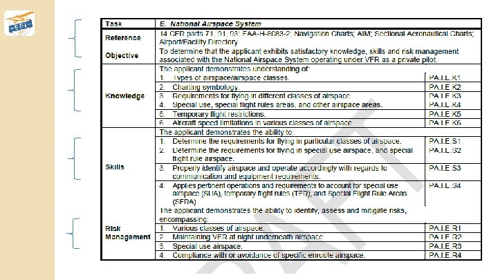 STANDARDS FAA Practical Test Standards Select areas taught by applicants Duration = 20 mins – 2 hours Criteria = Pilots Handbook of Aeronautical Knowledge at minimum