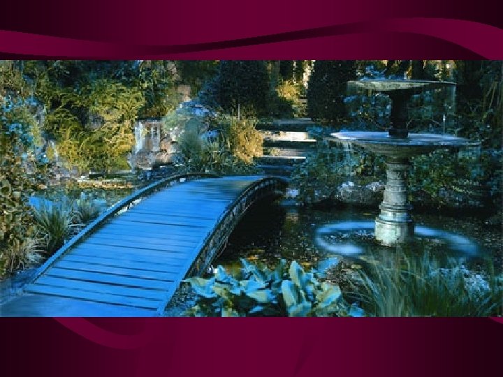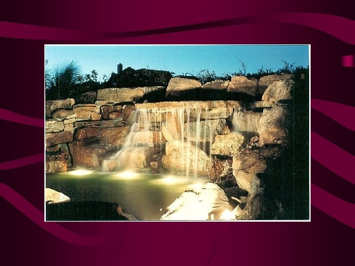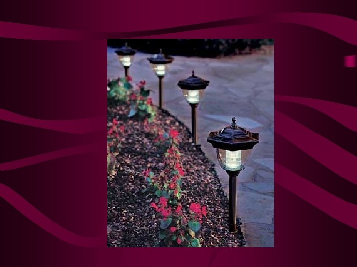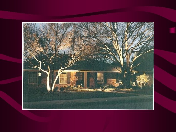 Lighting. Techniques • • • Down Lighting – from ht. in trees – cast shadow Area Lighting – lit paths, stairs, beds Up lighting – from below object Front lighting, side lighting, and backlighting Shadow lighting (lighting a plant or object on a wall) • Accent lighting • Silhouetting