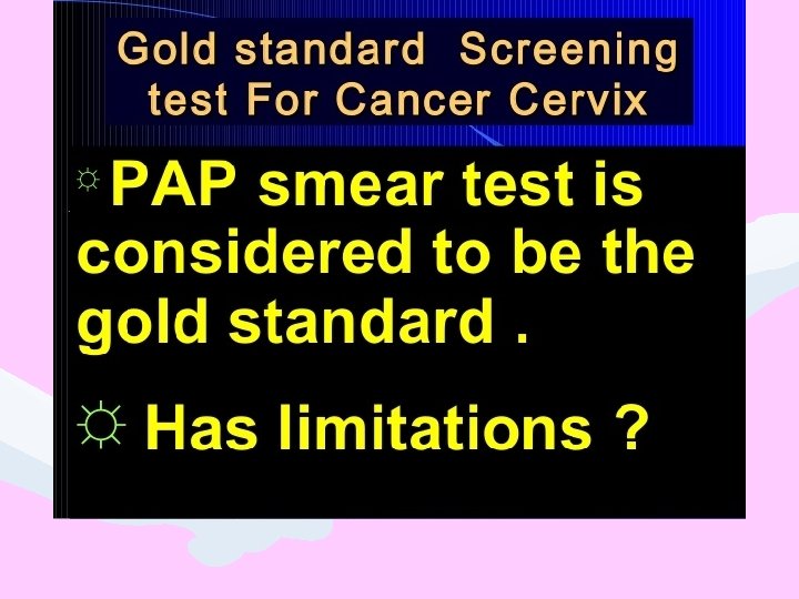 Aim: To Make a Cervical Cancer Free Society… Screening and identification of High Risk groups Education – Discourage marriage at early age. Think of Cervical Cancer as an extension of STD Behavioral changes Avoid multiple sexual partners. Delay early age of sexual intercourse Avoid STD – Use of Condoms. Avoid Smoking HPV Vaccines to be promoted at the right age