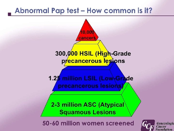 How accurate are cervical cancer screening test results? Cervical cancer screening results are not always accurate. • Sometimes “false-positive” result. (i. e. the results show abnormal cells when the cells are normal) • Sometimes “false-negative” result. ( also may not detect abnormal cells when they are present. ) To help prevent false-negative or false-positive results, one should avoid: 1. 2. 3. 4. douching, sexual intercourse, and using vaginal medications or hygiene products for 2 days before the test. Avoid cervical cancer screening when you have your menstrual period. 30