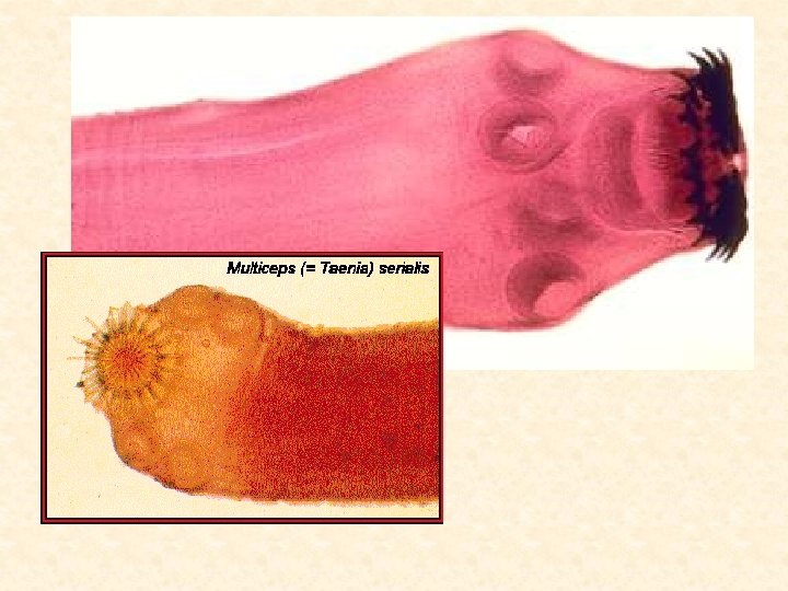 Taenia pisiformis • Intestino delgado de perro. • Mide 0. 3 -2 mts de longitud. Escólex globoso y rostelo armado de 34 -48 ganchos. • Fase larvaria : Cysticercus pisiformis que se desarrolla en hígado, estómago, pulmón y cerebro de lagomorfos. • El Cysticercus tiene apariencia de “racimo de uvas”