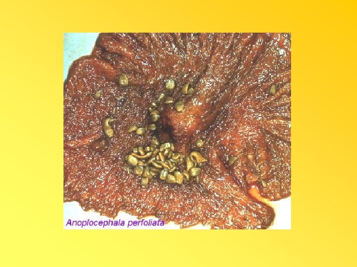 Anoplocephala perfoliata • Se presenta en intestinos delgado y grueso de caballos y asnos. • Los adultos miden hasta 5 cm de longitud y 1. 2 de anchura. • Los proglótidos son más anchos que largos, con un solo juego de órganos reproductores. Los huevos miden de 65 -80 micras de diámetro.